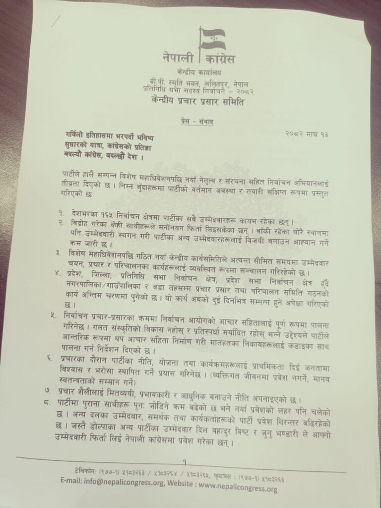 कांग्रेसले १६५ वटै निर्वाचन क्षेत्रमा उम्मेदवार तय गर्याे, १०६ जना नयाँ अनुहार मैदानमा