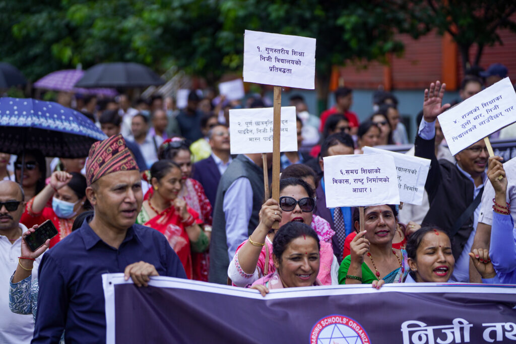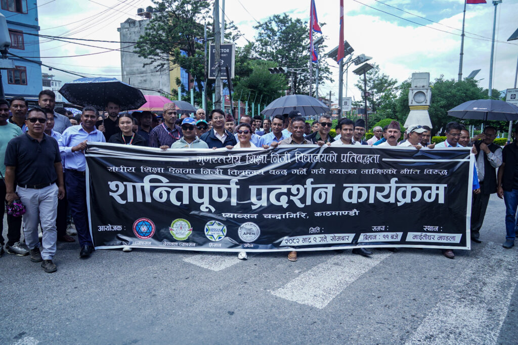 साथै उनीहरुले राज्यले शिक्षकको ठूलो भार, निजी विद्यालयले लाउँदैछन् पार, गुणस्तरीय शिक्षा निजी विद्यालको प्रतिवद्धता, समग्र शिक्षाको विकास, राष्ट्र निर्माणको आधार जस्ता प्लेकार्डहरु समेत नारा लगाएका थिए ।