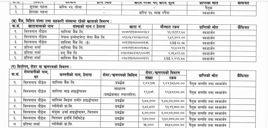 पौडेलले बुधबार सार्वजनिक गरेको सम्पत्ति विवरण अनुसार उनीसँग करिब १८ करोड ६५ लाख रुपैयाँ बराबरको चल अचल सम्पत्ति रहेको छ । जसमध्ये सानिमा बैंकमा उनको २ करोड ४४ लाख रुपैयाँ बराबरको सेयर रहेको देखिएको हो ।