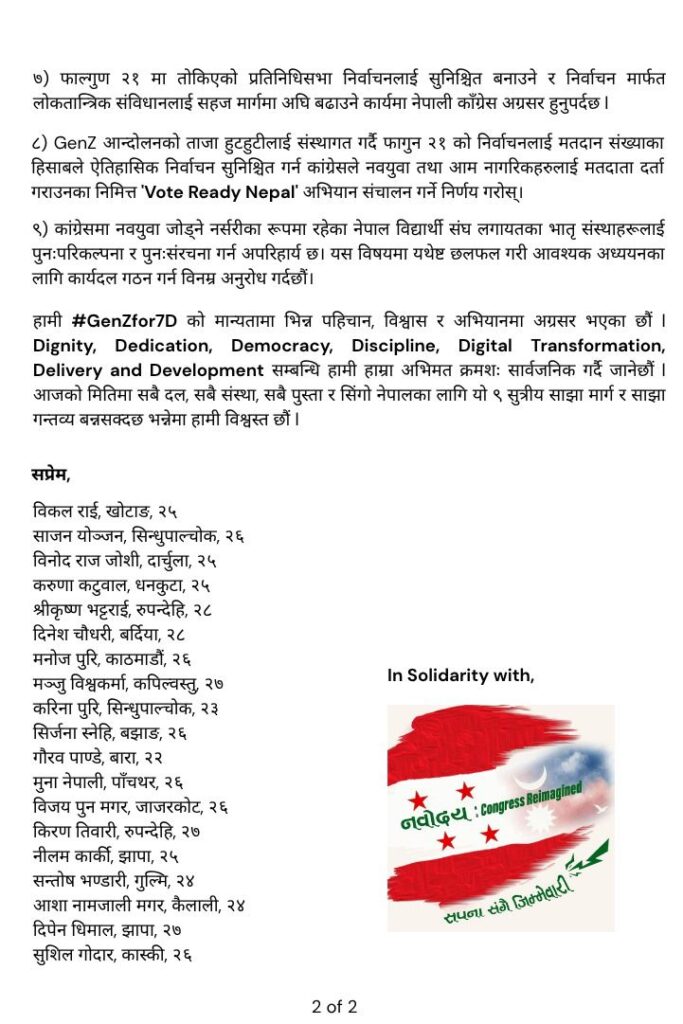 काठमाडौं । नेपाली कांग्रेसका जेनजी युवाहरुले नौं बुँदे माग राख्दै विधानमा संशोधन गरी जेनजी उमेर समूहका युवाहरु समेट्न माग गरेका छन् ।