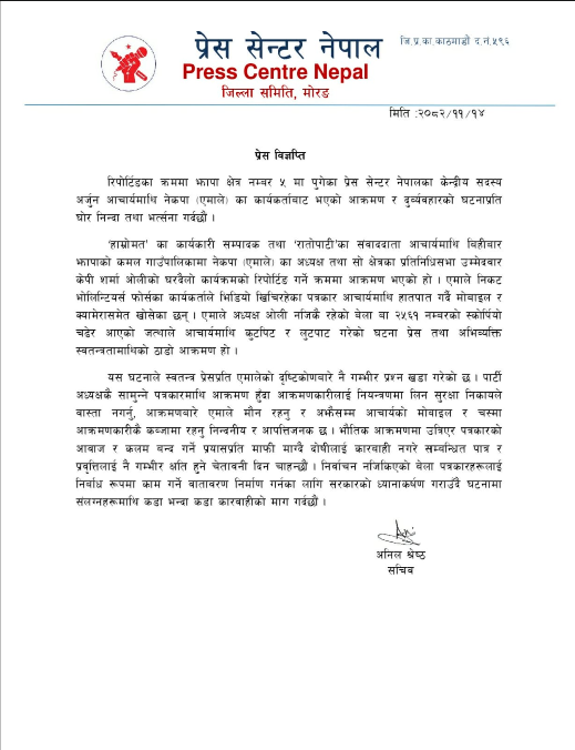 ूपार्टी अध्यक्षकै सामुन्ने पत्रकारमाथि आक्रमण हुँदा आक्रमणकारीलाई नियन्त्रणमा लिन सुरक्षा निकायले वास्ता नगर्नु, आक्रमणबारे एमाले मौन रहनु र अझैसम्म आचार्यको मोबाइल र चस्मा फिर्ता नहुनु निन्दनीय र आपत्तिजनक छ,’ विज्ञप्तिमा भनिएको छ।