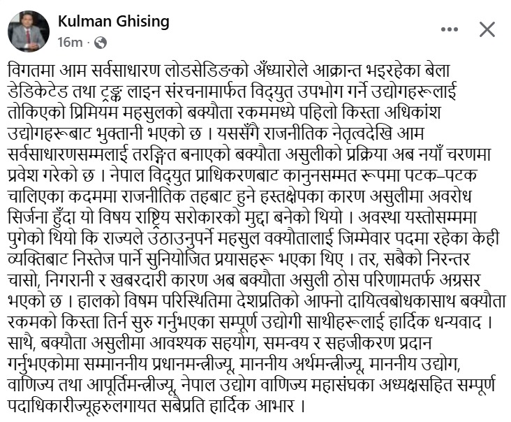 उनले लेखेका छन्, ‘राजनीतिक नेतृत्वदेखि आम सर्वसाधारणसम्मलाई तरङ्गित बनाएको बक्यौता असुलीको प्रक्रिया अब नयाँ चरणमा प्रवेश गरेको छ । नेपाल विद्युत प्राधिकरणबाट कानुनसम्मत रूपमा पटक–पटक चालिएका कदममा राजनीतिक तहबाट हुने हस्तक्षेपका कारण असुलीमा अवरोध सिर्जना हुँदा यो विषय राष्ट्रिय सरोकारको मुद्दा बनेको थियो,’ उनले थप लेखेका छन्, ‘अवस्था यस्तोसम्ममा पुगेको थियो कि राज्यले उठाउनुपर्ने महसुल वक्यौतालाई जिम्मेवार पदमा रहेका केही व्यक्तिबाट निस्तेज पार्ने सुनियोजित प्रयासहरू भएका थिए । तर, सबैको निरन्तर चासो, निगरानी र खबरदारी कारण अब बक्यौता असुली ठोस परिणामतर्फ अग्रसर भएको छ ।’