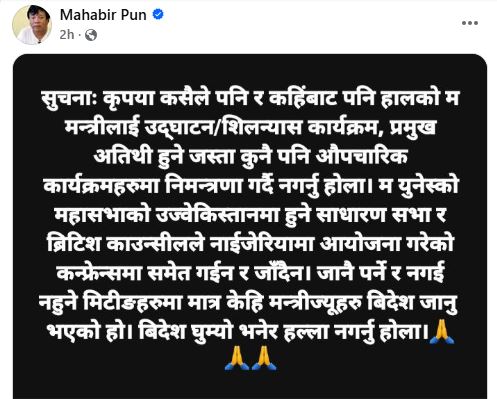 मन्त्री पुनले सामाजिक सञ्जालमा लेखेका छन्, ‘कृपया कसैले पनि र कहिंबाट पनि हालको म मन्त्रीलाई उद्घाटन÷ शिलन्यास कार्यक्रम, प्रमुख अतिथी हुने जस्ता कुनै पनि औपचारिक कार्यक्रमहरुमा निमन्त्रणा गर्दै नगर्नुहोला ।’