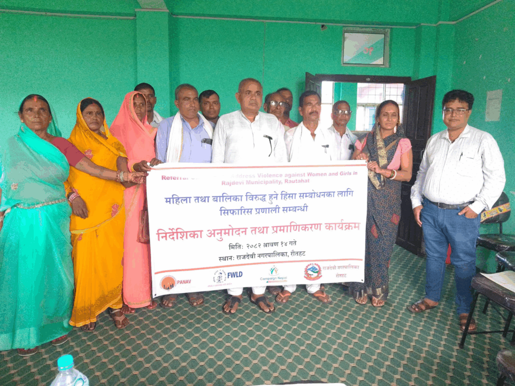 रौतहटको राजदेवी नगरपालिकामा महिला तथा बालिका विरुद्ध हुने हिंसाको प्रभावकारी सम्बोधनका लागि सिफारिस प्रणाली सम्बन्धी निर्देशिका अनुमोदन तथा प्रमाणीकरण कार्यक्रम भव्य रूपमा सम्पन्न भएको छ। राजदेवी नगरपालिकाको सभाहलमा आयोजित यस एक दिने कार्यक्रममा नगर प्रमुख भिखारी प्रसाद यादवको अध्यक्षतामा कार्यपालिका बैठक बसेर कार्यक्रमको औपचारिक उद्घाटन गरिएको थियो।