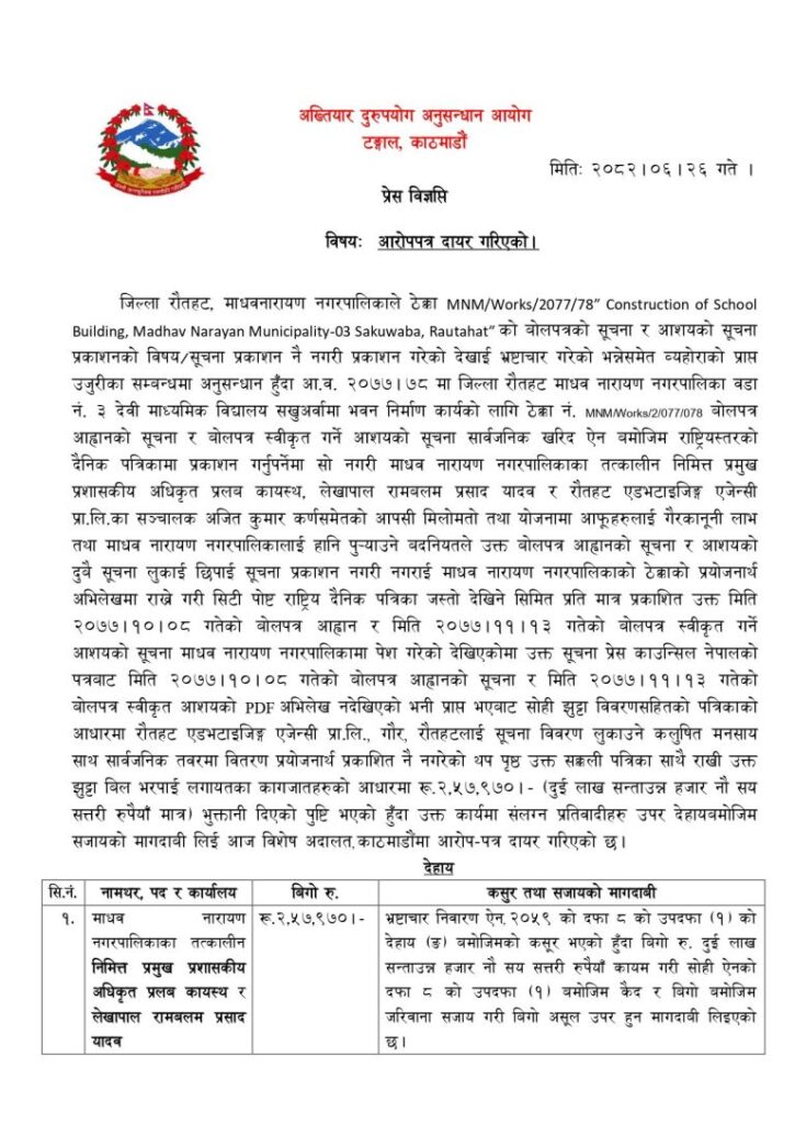 रौतहट । अख्तियार दुरुपयोग अनुसन्धान आयोगले रौतहटको माधवनारायण नगरपालिकाका तत्कालीन निमित्त प्रमुख प्रशासकीय अधिकृत सहित तीन जना विरुद्ध विशेष अदालत, काठमाडौँमा आरोपपत्र दायर गरेको छ ।