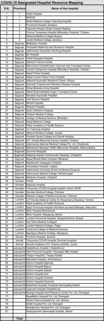 काठमाडौं । सरकारले कोभिड १९ को उपचारको लागि देशभरका ८१ वटा अस्पतालसँग सम्झौता गरेको छ। सम्झौता गरिएका ती अस्पतालमा कोभिड बिरामीको उपचारमा लाग्ने खर्च बेहोर्ने स्वास्थ्य तथा जनसंख्या मन्त्रालयले जनाएको छ। यसरी सम्झौता गरेका अस्पतालमध्ये प्रदेश १ मा तीनवटा, प्रदेश २ मा पाँच, बागमती प्रदेशमा ३७ अस्पताल छन्। त्यस्तै गण्डकी प्रदेशका पाँच, लुम्बिनी प्रदेशमा १०, कर्णालीमा तीन र सुदूरपश्चिमका १८ अस्पतालसँग सम्झौता गरिएको छ। सरकारले यी अस्पताललाई कोभिड–१९ का बिरामीको उपचार गरेबापत् शोधभर्ना दिन्छ।
