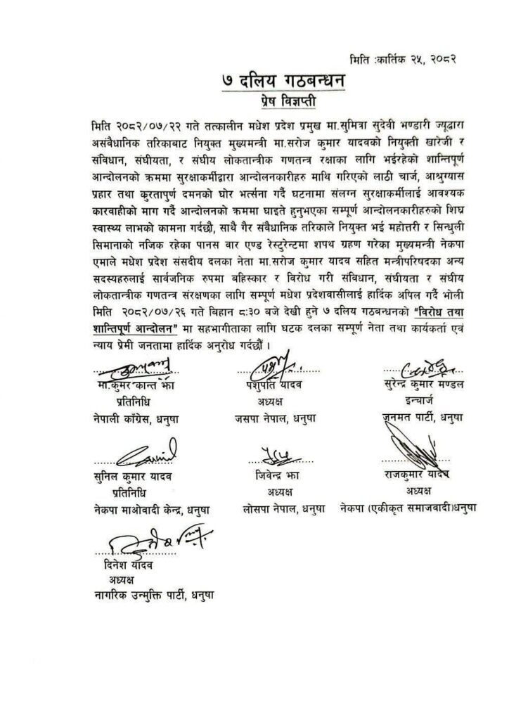 सात दलिय गठबन्धनले तत्कालीन मधेश प्रदेश प्रमुख सुमित्रा सुवेदी भण्डारीले असंवैधानिक तरिकाबाट सरोज कुमार यादवलाई मुख्यमन्त्रीमा नियुक्त गरेको भन्दै नियुक्ति खारेजी गर्नु पर्ने माग राखेको छ । उनीहरुले हिजो भएको लाठी चार्जमा संलग्न सुरक्षाकर्मीहरुलाई पनि कारवाही गर्नुपर्ने माग अघि सारेका छन् । उनीहरुले मुख्यमन्त्री सरोज कुमार यादवसहित मन्त्रीपरिषदका अन्य सदस्यहरुलाई सार्वजनिक रुपमा बहिस्कार र विरोध गर्ने विज्ञप्तीमा उल्लेख रहेको छ ।