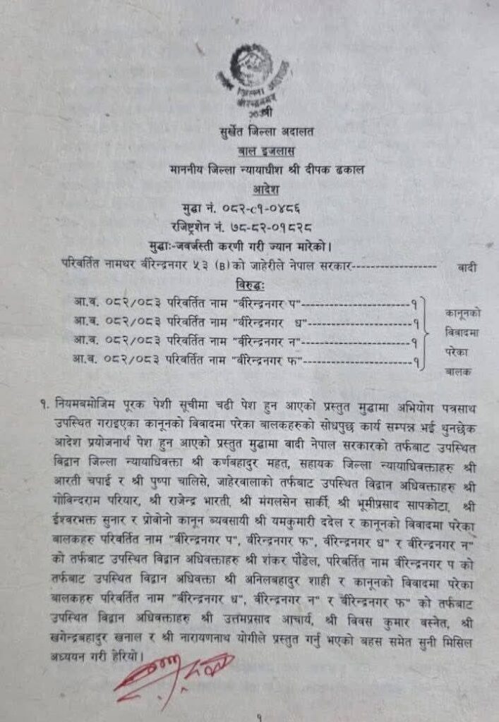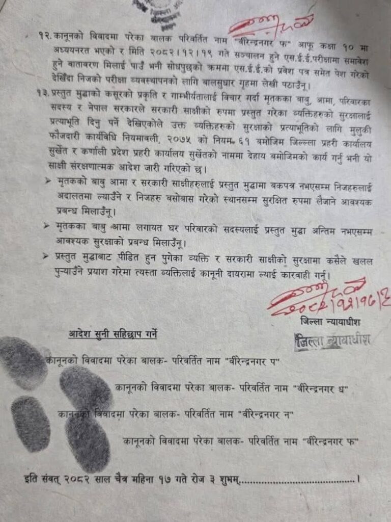 अदालतका सूचना अधिकारी उज्ज्वल रावलकारअनुसार घटनाको गम्भीरता र प्रारम्भिक प्रमाणका आधारमा अनुसन्धान पूरा नहुँदासम्म थुनामै राखेर मुद्दा अघि बढाउने आदेश गरिएको हो । सोमबारदेखि बाल इजलासमा सुनुवाइ भई रहेको उक्त मुद्दामा मंगलबारको थुनछेक बहसपछि अदालतले यस्तो आदेश दिएको हो ।