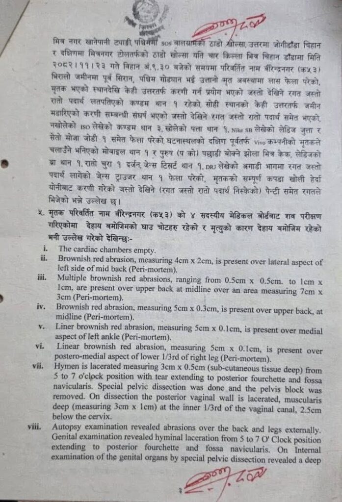 प्रहरीले अनुसन्धानकाक्रममा इनिशा घटनामा सामूहिक बलात्कारको तथ्य फेला नपरेको भन्दै मुख्य अभियुक्तलाई जवरजस्तीकरणीसहित कर्तव्य ज्यान र अन्य तीन जनालाई कर्तव्य ज्यानमा मुद्दा चलाउन माग गर्दै सरकारी वकिल कार्यालयमा प्रतिवेदन बुझाएको थियो । सरकारी वकिलको कार्यालयले अभियुक्तलाई मुलुकी अपराध संहिता २०७४ को दफा २१९ को १, २ र ७ अनुसार कैद सजाय र जरिवाना मागवादी गरी अभियोग दायर गरेको थियो ।
