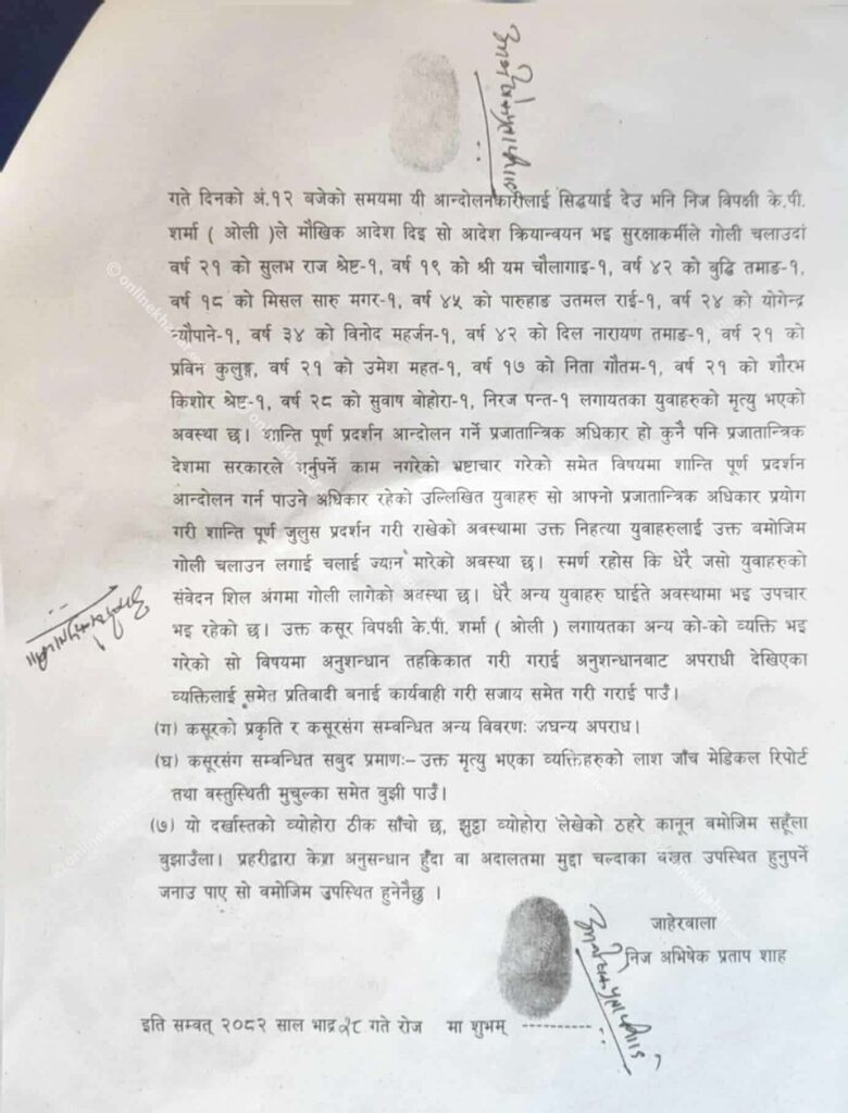 जेनजी पुस्ताका युवाहरूको शान्तिपूर्ण प्रदर्शनमा हिंसा मच्चाएको भन्दै नेपाली कांग्रेसका नेता एवं पूर्व सांसद अभिषेक प्रताप शाहले महानगरीय प्रहरी वृत्त नयाँ बानेश्वरमा जाहेरी दिएका हुन् ।