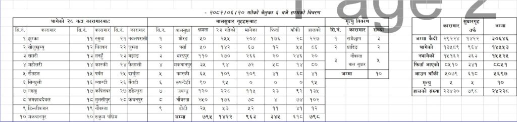 नभागेका कुल कैदी १५ हजार ५ सय २५ छन् भने त्यसमा कारागारका १५ हजार १ सय ६२ छन् भने सुधारगृहबाट ६ सय ६३ जना छन् । यसका साथै भागेका मध्ये कुल ८ हजार ८ सय ५१ जना कैदी फिर्ता आएका छन् । त्यसमा कारागारका ८ हजार ५ सय १० छन् भने सुधारगृहका ३ सय ४१ जना रहेका छन् ।