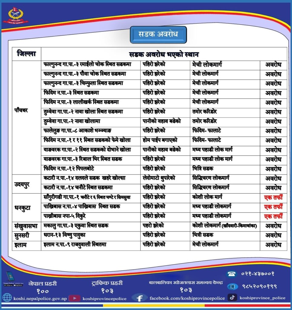 मेची, तमोर र कोशी करिडोरका मुख्य सडक खण्डहरूमा पहिरो झरेको, पानीको बहाव बढेको र सडक अवरुद्ध भएको छ ।