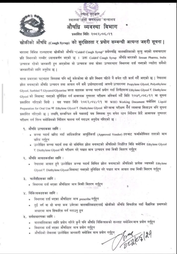 ‘नेपालमा झोल बनावटको औषधि उत्पादन तथा आयात गर्ने सबै उद्योगहरुलाई आफ्नो उत्पादनमा प्रोपाइलिन ग्लाइकोल, पोलिइथिलिन ग्लाइकोल, सोर्बिटोल ÷ ग्लिसरोल ग्लिसरीन जस्ता सहायक कच्चा पदार्थ प्रयोग गर्दा तिनीहरूमा इथिलीन ग्लाइकोल र डाइइथिलिन ग्लाइकोलको मिसावट नभएको सुनिश्चित गर्न आवश्यक गुणस्तर परीक्षण अनिवार्य गर्दै मिति २०७९÷०८÷१२ मा सूचना प्रकाशित गरिएको थियो । यस पश्चात मिति २०८२÷०४÷२१ मा ध्ज्इ कार्य कागजात वमोजिम मौखिक प्रयोगको लागि तरल तयारीमा इथाइलिन ग्लाइकोल र डाइइथिलिन ग्लाइकोलको मात्रा परीक्षण गर्न व्यवस्था मिलाउन भनि सूचना प्रकाशित गरिएको छ,’ सूचनामा उल्लेख गरिएको छ ।