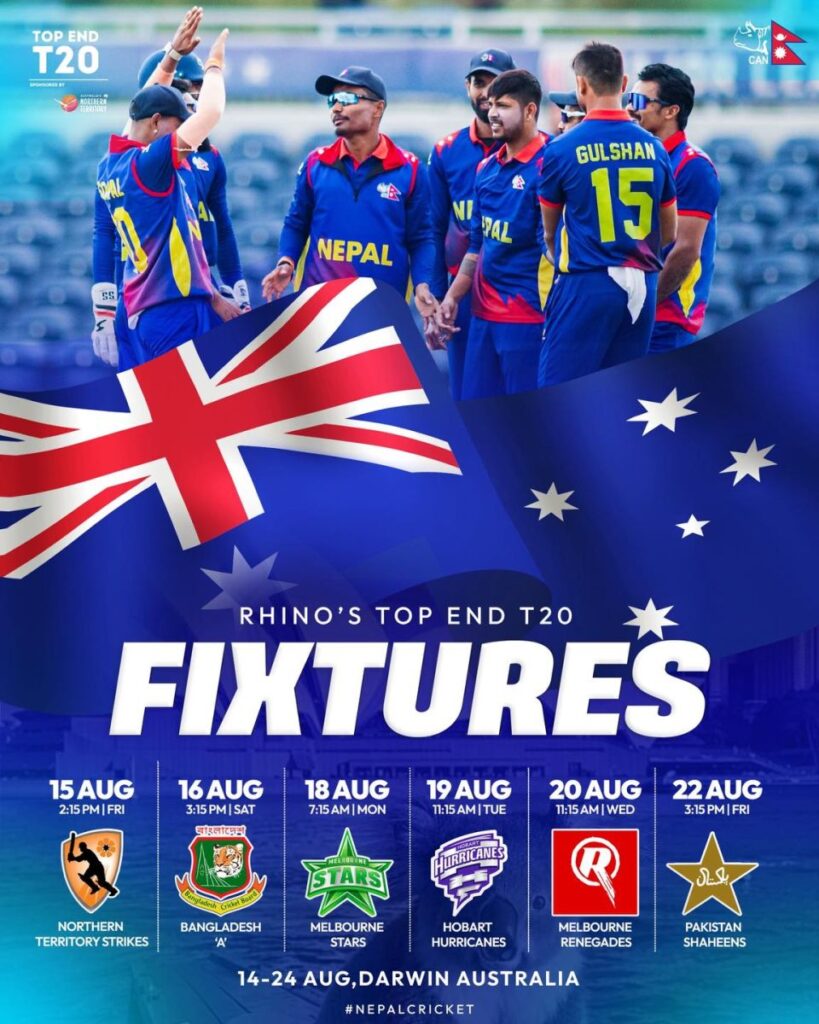 प्रतियोगितामा नेपालले पहिलो खेल (भोली) अगस्ट १५ मा नर्दर्न टेरिटोरी स्ट्राइकरसँग खेल्नेछ । त्यसपछि नेपालले बंगलादेश ‘ए’ १६ अगस्टमा, मेलबर्न स्टार्स १८ अगस्टमा, होबर्ट हुरिकेन्स १९ अगस्टमा, २० मा मेलबर्नसँग २० अगस्ट र पाकिस्तान साहिन्सासँग २२ अगस्टमा खेल्नेछ ।