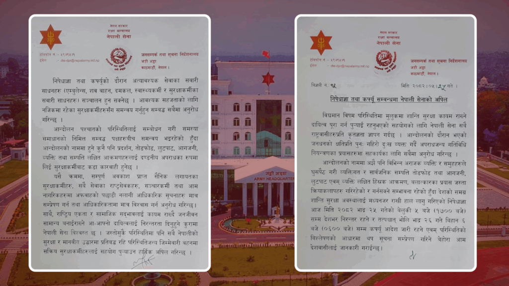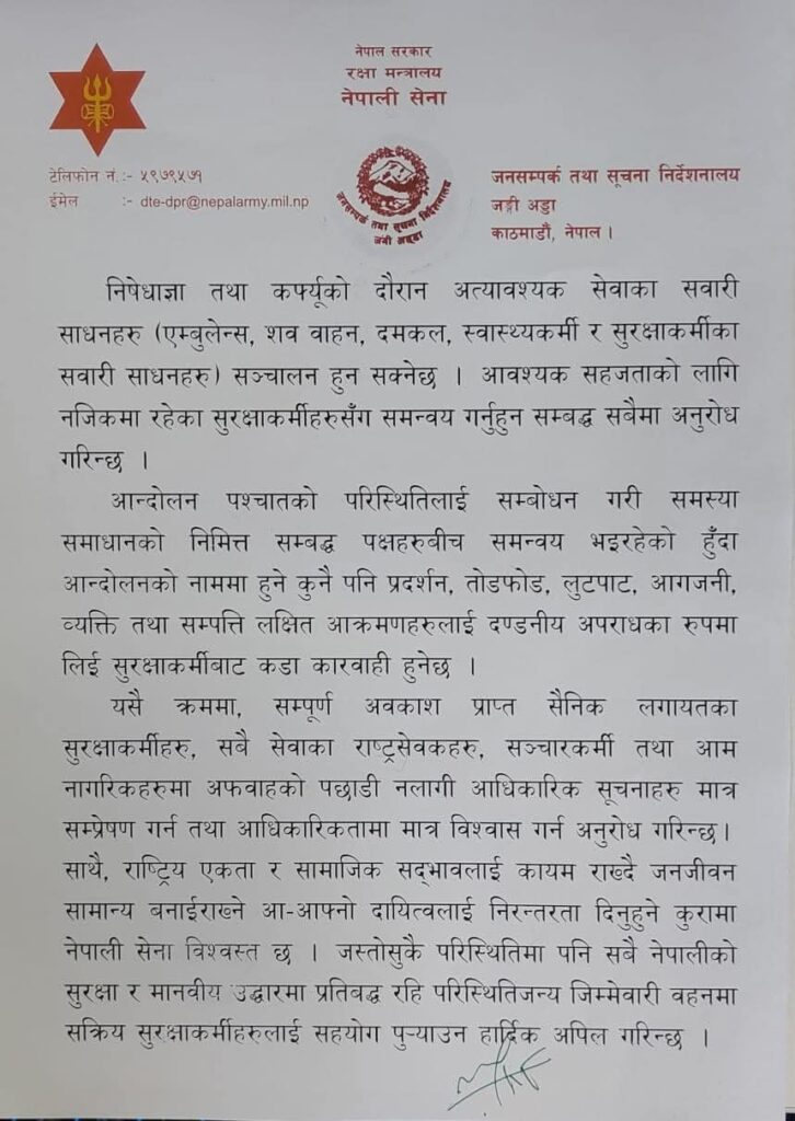 सैनिक जनसम्पर्क निर्देशनालयले बुधबार जारी गरेको विज्ञप्तिमा उल्लेख छ, ‘आन्दोलनका नाममा अझै पनि विभिन्न अराजक व्यक्ति र समूहले घुसपैठ गरी व्यक्तिगत र सार्वजनिक सम्पत्ति तोडफोड तथा आगजनी, लुटपाट एवम् व्यक्ति लक्षित हिंस्रक आक्रमण, बलात्कारका प्रयासजस्ता क्रियाकलाप गरिरहेको र गर्नसक्ने सम्भावना रहेको हुँदा देशको समग्र शान्ति सुरक्षा अवस्थालाई दृष्टिगत राखी हाल लागू गरिएको निषेधाज्ञा आज मिति २०८२ भाद्र २५ गतेको बेलुकी ५ बजे बजेसम्म देशभर निरन्तर रहने र तत्पश्चात् भोलि भाद्र २६ गते बिहान ६ ब सम्म कफ्र्यु आदेश जारी रहने एवम् परिस्थितिको विश्लेषणका आधारमा थप सूचना सम्प्रेषण गरिने बेहोरा आमदेशवासीलाई जानकारी गराइन्छ ।’