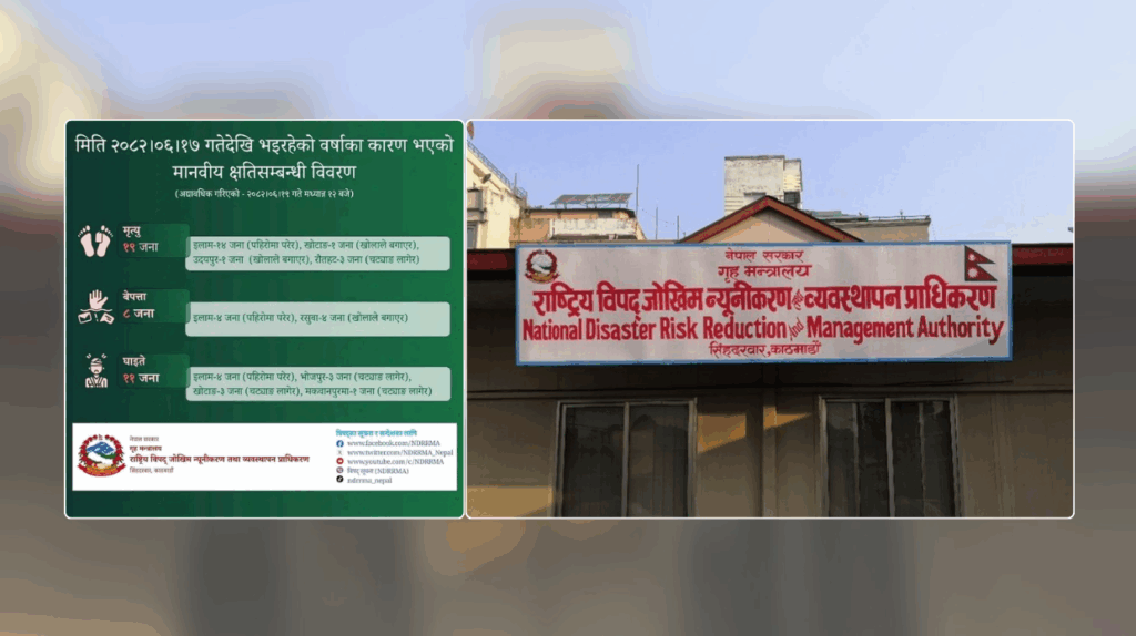 काठमाडौं । राष्ट्रिय विपद् जोखिम न्यूनीकरण तथा व्यवस्थापन प्राधिकरणले असोज १७ गतेदेखि देशभर जारी अविरल वर्षाका कारण हालसम्म १९ जनाको मृत्यु भएको जनाएको छ । प्राधिकरणले आइतबार १२ बजेसम्मको अवस्थाबारे जानकारी गराएको हो ।
