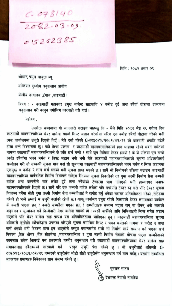 बालेनले मात्र प्रयोग गर्ने लिफ्ट र महानगरको भवन मर्मतमा चार करोड दुई लाख रुपैयाँ घोटाला भएको दाबी गर्दै सिन्धुलीका युवराज सफलले आज फेरि उजुरी दर्ता गराएका हुन् ।
