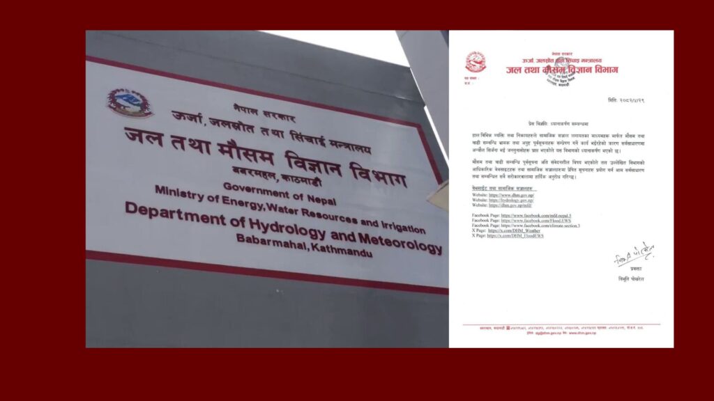 काठमाडौं । जल तथा मौसम विज्ञान विभागले हाल विभिन्न सामाजिक सञ्जाल तथा अन्य माध्यमहरूमा मौसम र बाढीसँग सम्बन्धित भ्रामक र अपुष्ट सूचनाहरू प्रसारण भइरहेकोप्रति गम्भीर ध्यानाकर्षण भएको जनाएको छ ।