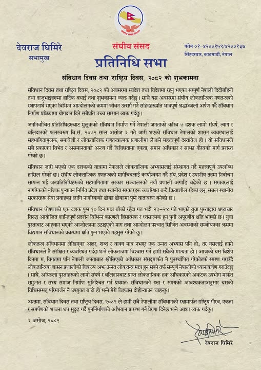 काठमाडौं । संविधान दिवस तथा राष्ट्रिय दिवस २०८२ को अवसरमा संघीय संसद प्रतिनिधिसभाका सभामुख देवराज घिमिरेले शुभकामना सन्देश जारी गरेका छन् । सन्देशमार्फत सभामुख घिमिरेले स्वदेश तथा विदेशमा रहेका सम्पूर्ण नेपाली दिदीबहिनी तथा दाजुभाइहरूमा हार्दिक बधाई तथा शुभकामना व्यक्त गरेका छन् ।