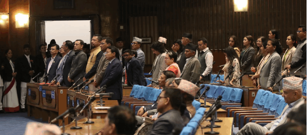 प्रतिपक्षले विरोध गरेपछि सत्तापक्षका सांसदहरू पनि उठ्छन् र टेबुल ठोक्छन् ।